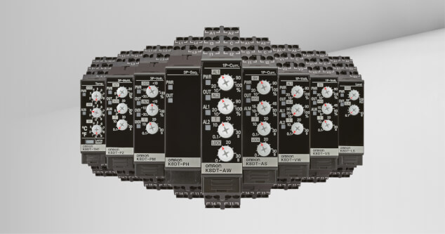 Voorbeeld: De K8DT bewakingsrelais van OMRON beschermen tegen spanningsasymmetrie, faseverlies en onregelmatigheden in stroom en bieden real-time waarschuwingen om storingen te voorkomen in sectoren variërend van voedselproductie tot halfgeleiderproductie.